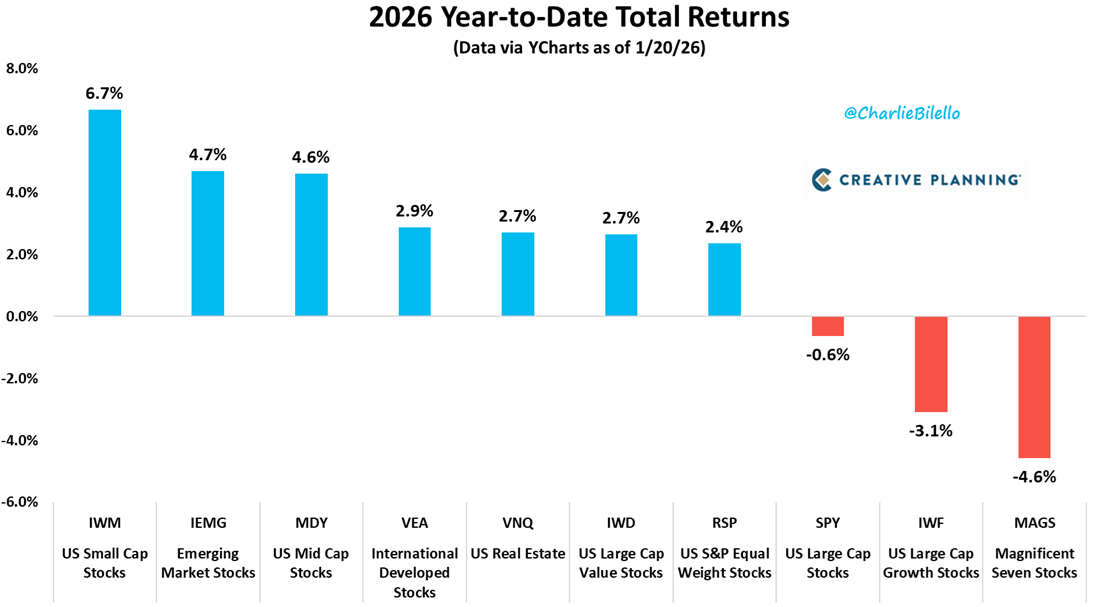אם בשנים האחרונות התרגלנו לכך שחברות הטכנולוגיה הגדולות מובילות את השוק, הגרף הבא מראה שהתמונה התהפכה לחלוטין בפתיחת 2026. הנתונים מראים ביצועי חסר ברורים של מדד ה-S&P 500 ומניות הצמיחה, שנמצאים בטריטוריה שלילית מתחילת השנה. לעומת זאת, דווקא הסקטורים שהיו מוכים בעבר זורחים כעת: המניות הקטנות (Small Caps) עלו ב-4.2%, מניות הערך (Value) הוסיפו 2.7%, וסקטור הנדל"ן (REITs) עלה גם הוא ב-2.7%. עבור המשקיעים זהו איתות לרוטציה משמעותית של כספים החוצה מהטכנולוגיה ולתוך הכלכלה המסורתית.
