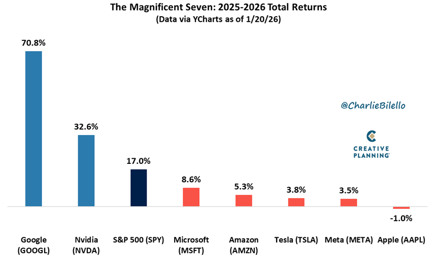 במבט עמוק יותר לתוך קבוצת "שבע המופלאות" (Mag 7), הגרף מגלה שהקבוצה הזו כבר אינה מקשה אחת. למעשה, חמש מתוך שבע המניות בקבוצה מציגות ביצועים גרועים יותר ממדד ה-S&P 500 מתחילת 2025. רק גוגל ואנבידיה מצליחות לשמור על הראש מעל המים ולמסך את החולשה של השאר. הנתון הזה קריטי למשקיעים שמחזיקים במדדים או בקרנות טכנולוגיה, שכן הוא מעיד שהמנוע העיקרי של השוק בשנים האחרונות מתחיל לקרטע.