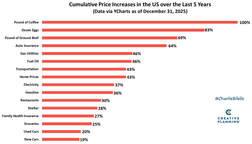 אחד הגרפים המקוממים ביותר בדו"ח משווה בין האינפלציה הרשמית למחירים בסופר. בעוד המדד הרשמי מראה עלייה של כ-25% בחמש השנים האחרונות, מחירי המוצרים הבסיסיים מספרים סיפור אחר לגמרי: מחיר הקפה זינק ב-100%, ביצים ב-83%, בשר בקר ב-69% וביטוח רכב ב-64%. הגרף הזה מסביר מדוע הצרכן האמריקאי מרגיש עני יותר, למרות שהנתונים הרשמיים טוענים שהאינפלציה "מנוצחת".