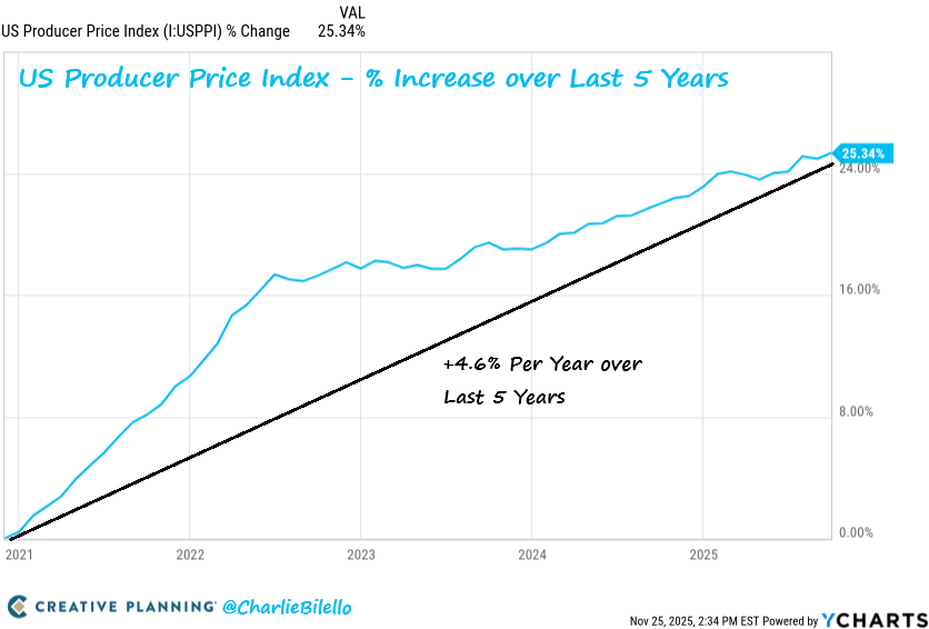 הגרף של האינפלציה השנתית מראה שהמדד (CPI) תקוע מעל היעד של הפד כבר 58 חודשים ברציפות. בנוסף, מדד המחירים ליצרן (PPI) עלה ב-25.3% בחמש השנים האחרונות (קצב של 4.6% בשנה). כשהעלויות ליצרן עולות, זה רק עניין של זמן עד שהן מתגלגלות לצרכן, מה שמרמז שהאינפלציה לא הולכת לשום מקום.