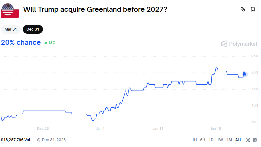ואם כבר גרינלנד, גרף משוקי ההימורים (Polymarket) נותן כרגע סיכוי של 20% בלבד לכך שטראמפ אכן ירכוש את גרינלנד לפני 2027. השוק כרגע רואה בזה יותר רעש פוליטי מאשר מהלך ריאלי, במיוחד בשנת בחירות אמצע.
