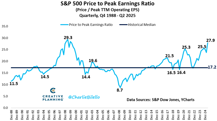 ה-S&P 500 עלה בעשור האחרון ב-248%, בעוד שהרווחים עלו רק ב-156% והמכירות ב-79%. במילים פשוטות: המכפילים תפחו. יחס המחיר לרווחי שיא (Price to Peak Earnings) עלה ל-27.9 - הרמה הגבוהה ביותר מאז שנת 2000 - והתשואת דיבידנד ירדה לשפל של 1.17%.