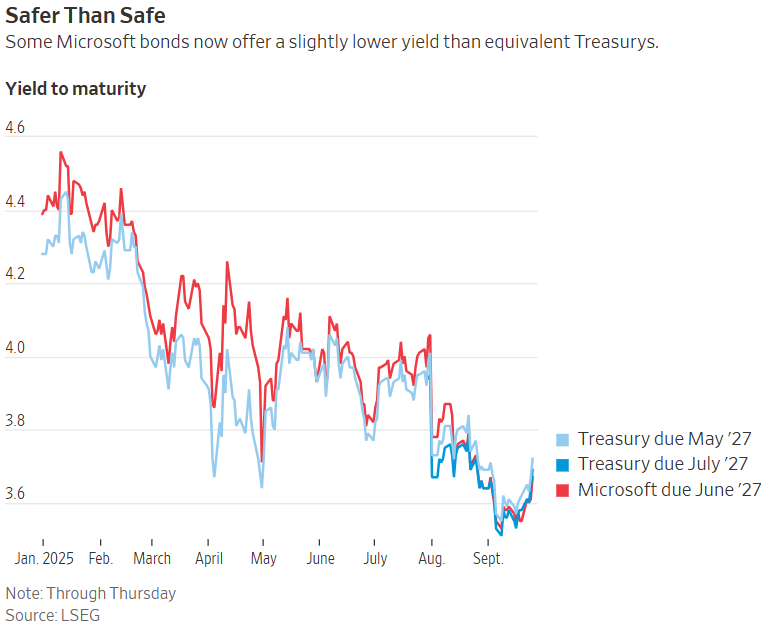 אג"ח מיקרוסופט נסחרות בתשואה נמוכה מזו של ממשלת ארה"ב - תופעה חריגה אך הגיונית: לחברה דירוג אשראי AAA, רווח נקי שנתי מעל 100 מיליארד דולר ו-95 מיליארד בקופה.