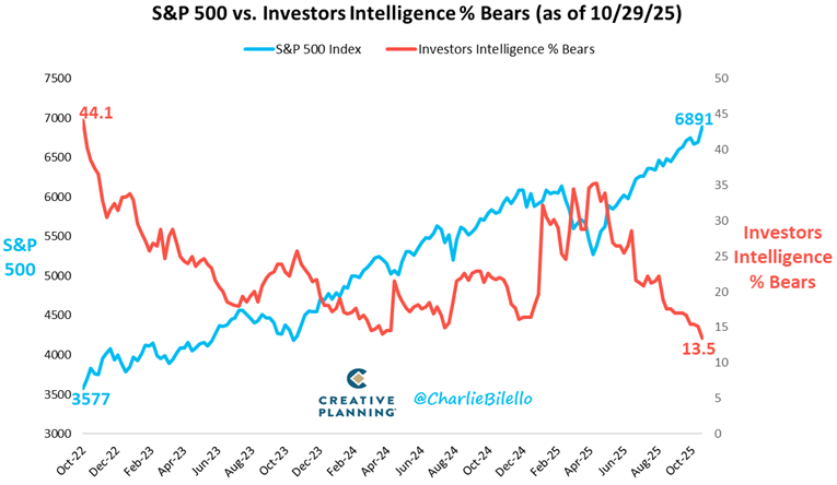 רק 13.5% מהמשתתפים במדד ה-Investors Intelligence מגדירים עצמם כדובים. זו רמה נמוכה יותר מ-98% מהקריאות ההיסטוריות, ולא נראתה מאז ינואר 2018 - אז נרשמה לאחר מכן ירידה של כ-12% במדד S&P 500.
