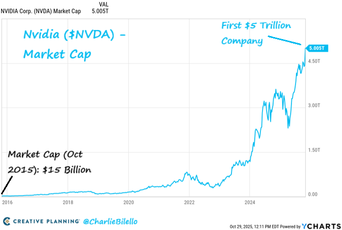 לפני עשור בלבד, Nvidia הייתה שווה 15 מיליארד דולר. היום היא כבר שווה 5 טריליון - עלייה של פי 335. זו החברה הראשונה בהיסטוריה שמגיעה לרמה הזו.
