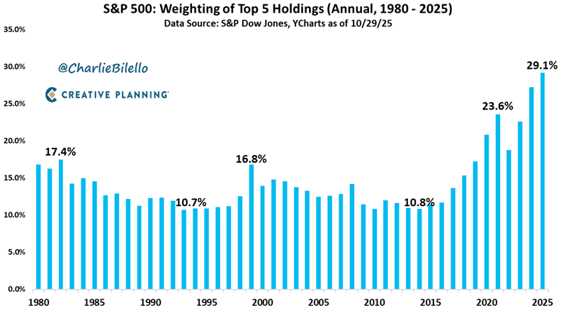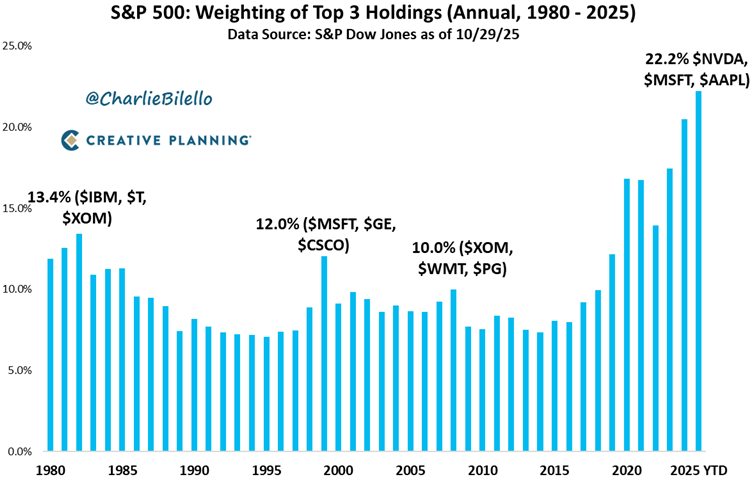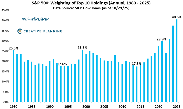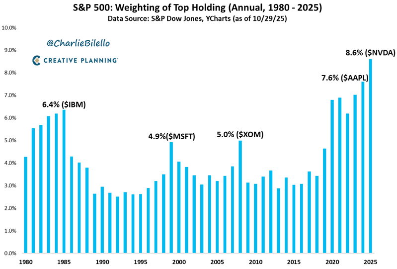 Nvidia לבדה מהווה 8.6% מהמדד - יותר מכל מניה אחרת בהיסטוריה. שלוש הגדולות - Nvidia, Microsoft ו-Apple - שוות יחד מעל 22% מהמדד. חמש הגדולות כבר מחזיקות ביותר מ-29%, ועשרת הגדולות ביותר מ-40%.