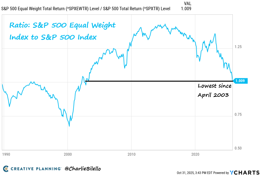 במקביל, היחס בין מדד S&P 500 Equal Weight למדד הרגיל נמצא ברמה הנמוכה מאז 2003 - כלומר, רוב המניות כלל לא משתתפות בעליות. זו לא בועה כוללת, זו בועה ממוקדת.