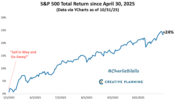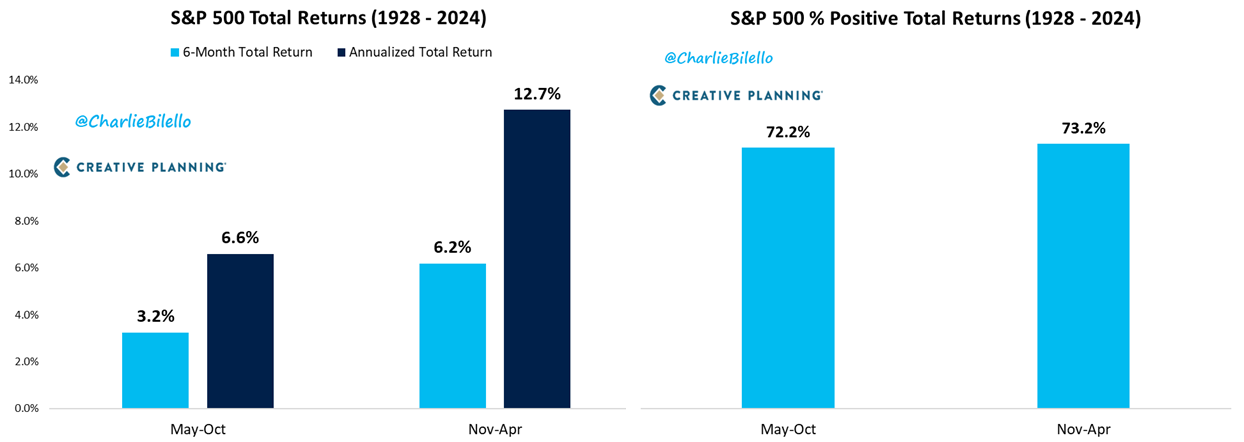 הגרף הזה מפריך את אחת הקלישאות הוותיקות ביותר בוול סטריט. לאורך השנים, התקופה ממאי עד אוקטובר הייתה דווקא חיובית ברוב הזמן - והשנה השוק עלה 24% בחודשים הללו.