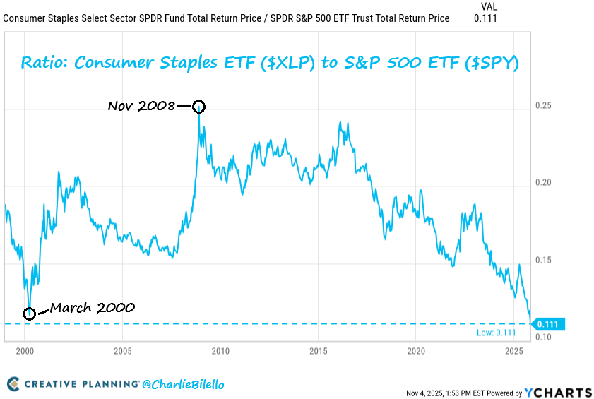 היחס בין קרן הסקטור ההגנתי XLP לבין מדד S&P 500 ירד לשפל של כל הזמנים - אפילו נמוך יותר מתקופת בועת הדוטקום בשנת 2000.