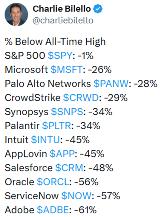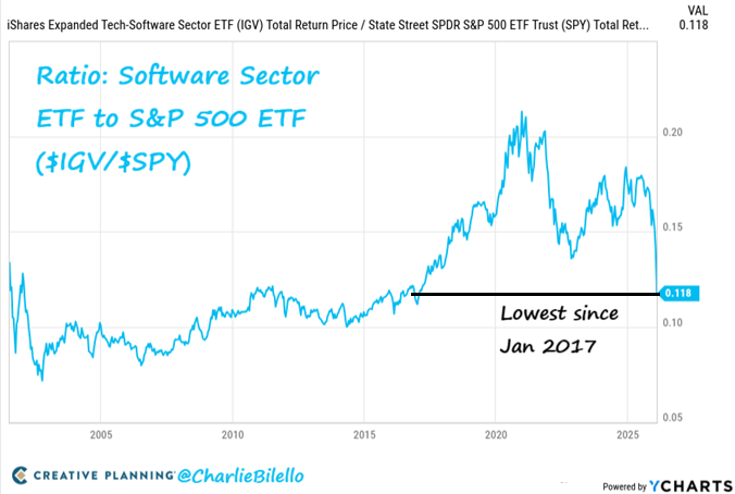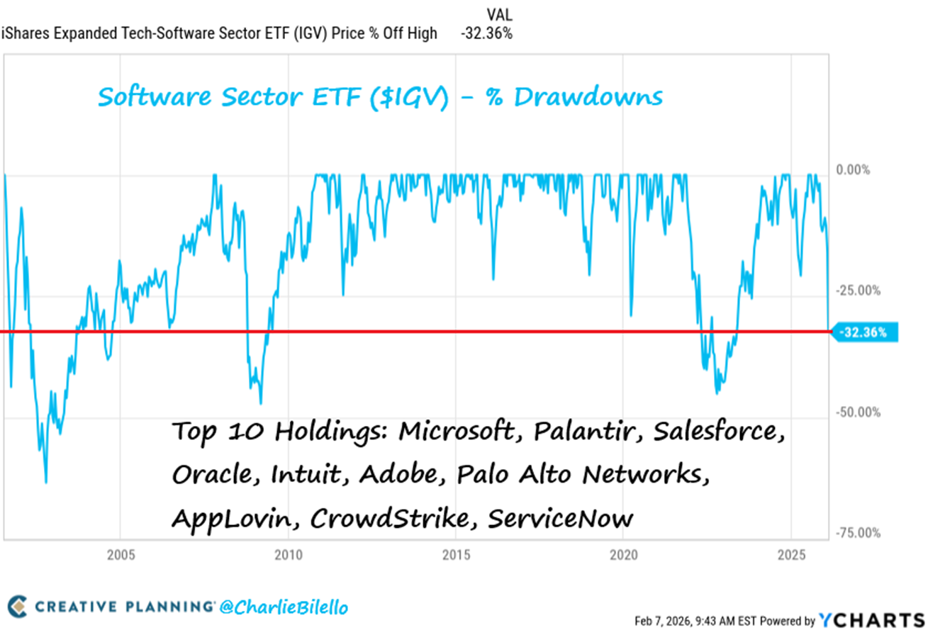 בזמן שמדד הדאו הגיע לשיא כל הזמנים, סקטור התוכנה חווה טלטלה אלימה. מדד התוכנה הציג ירידה דרמטית שהגיעה לשיא שלילי של 32 אחוזים מהשיא, הנפילה החדה ביותר מאז שוק הדובים של שנת 2022. הירידה הזו הואצה בעקבות שחרור יכולות חדשות של מודלי שפה ובינה מלאכותית, אשר מסוגלים לבצע משימות מורכבות כמו סקירת חוזים וניהול כוח אדם. המשקיעים מתחילים לתמחר תרחיש שבו ארגונים יפסיקו לשלם מיליוני דולרים לספקיות תוכנה מסורתיות, ויעברו לפתח כלים פנימיים מבוססי בינה מלאכותית. למרות הפחד הקיים בשוק, מעבר כזה אינו צפוי לקרות ביום אחד, וישנו סיכוי סביר שאנו רואים תגובת יתר המספקת הזדמנות השקעה מעניינת בחברות התוכנה הגדולות והרווחיות בעולם.