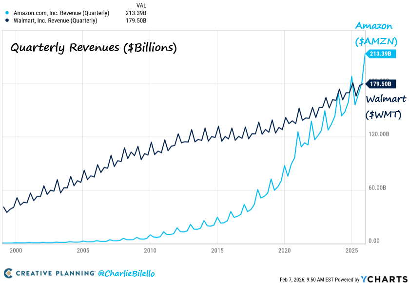 גרף ההכנסות ההיסטורי משווה בין וולמארט לאמזון ומספר את סיפורה של מהפכת המסחר האלקטרוני. אם לפני חצי יובל הכנסותיה של וולמארט היו גדולות פי 47 מאלו של אמזון, היום אנו רואים כיצד אמזון הצליחה לסגור את הפער ולעקוף אותה. השינוי הטקטוני הזה בהרגלי הצריכה מדגים את החשיבות של חדשנות טכנולוגית והתאמה למציאות משתנה. חברות שלא ישכילו להוביל את המגמות הדיגיטליות בעשור הקרוב, ימצאו את עצמן מאבדות נתח שוק במהירות.