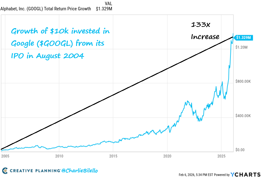 הגרף הבוחן את התשואה של גוגל מאז הנפקתה בשנת 2004 הוא עדות לכוחו של ריבית דריבית והשקעה לטווח ארוך בחברות משנות מציאות. השקעה של עשרת אלפים דולר בהנפקה הפכה היום לשווי של למעלה מ-1.3 מיליון דולר. זהו תזכורת חזקה למשקיעים שהדרך לייצר עושר אמיתי בשוק ההון עוברת באיתור עסקים בעלי יתרון תחרותי בר קיימא, והחזקה בהם לאורך שנים ארוכות, תוך התעלמות מרעשי הרקע וממשברים זמניים שצצים בדרך.