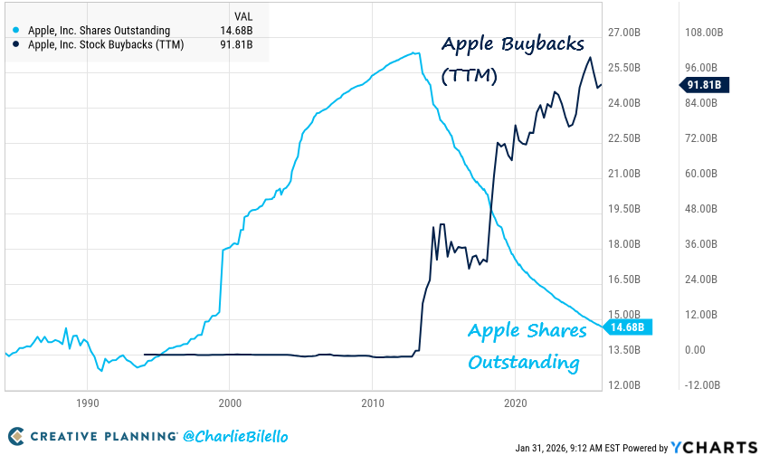 הגרף האחרון להשבוע מציג את תוכנית רכישת המניות העצמית של אפל, שהסתכמה ב-727 מיליארד דולר בעשור האחרון. סכום זה גדול יותר משווי השוק של כמעט 500 חברות במדד ה-S&P 500. חברות שמייצרות תזרים מזומנים עודף ברמה כזו ומשתמשות בו כדי להקטין את כמות המניות בשוק, מגדילות את הרווח למניה של המשקיעים באופן מתמשך. הנדסה פיננסית זו הפכה לאחד ממנועי התשואה המשמעותיים ביותר בוול סטריט, והיא גורם מרכזי שצריך לקחת בחשבון בניתוח כדאיות ההשקעה בחברות ענק מבוססות.