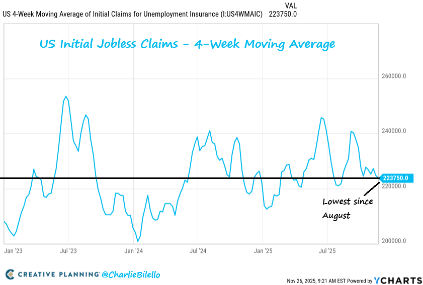 מה רואים בגרף: תביעות האבטלה הראשוניות בארה"ב ירדו לרמות הנמוכות ביותר מאז אוגוסט. הממוצע הארבע שבועי ירד ל-223,750.