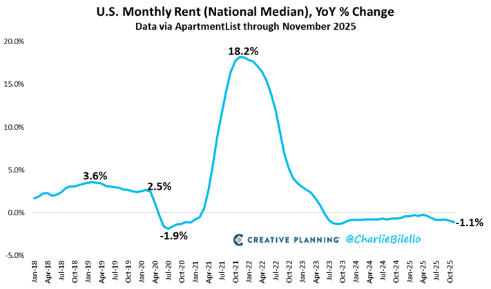 מה רואים בגרף: שכר הדירה בארה"ב ירד ב-1.1% בשנה האחרונה. זהו החודש ה-30 ברציפות של ירידה שנתית. לעומת זאת, העלות החודשית של קניית בית גבוהה כיום ב-40% מעלות השכירות.
