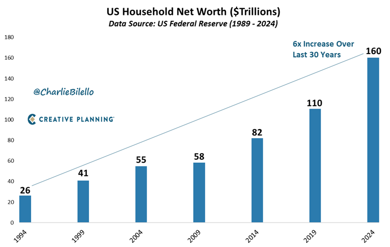 מה רואים בגרף: ההון נטו (Net Worth) של משקי הבית בארה"ב הגיע לשיא כל הזמנים של 160 טריליון דולר. זוהי עלייה של פי 6 ב-30 השנים האחרונות.