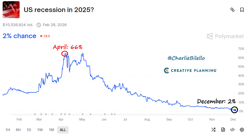 מה רואים בגרף: באפריל השנה, שוקי החיזוי (כמו Polymarket) נתנו סבירות של 66% למיתון בארה"ב ב-2025. כיום? הסיכוי צנח ל-2% בלבד. במקביל, מודל ה-GDPNow צופה צמיחה חזקה של 3.9% ברבעון השלישי.