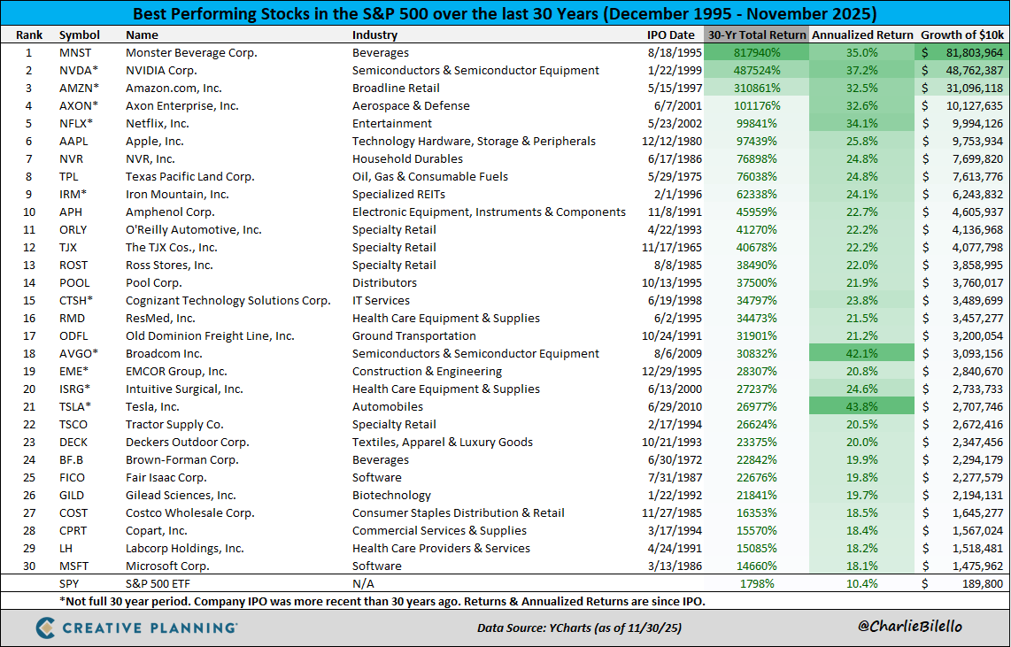 מה רואים בטבלה: בחנו את המניות עם הביצועים הטובים ביותר ב-30 השנים האחרונות ב-S&P 500. הרשימה מגוונת להפליא: משקאות אנרגיה (Monster במקום הראשון), שבבים (Nvidia), קמעונאות (Amazon), ציוד רפואי ואפילו חנויות מוזלות.