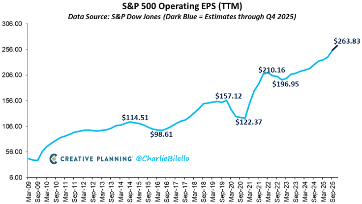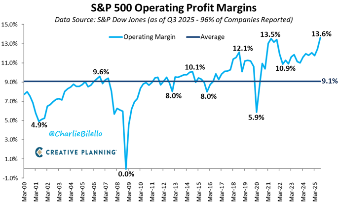 מה רואים בגרף: הרווחים התפעוליים של חברות המדד בדרך לשיא חדש ב-2025, עם עלייה של 13% בשנה האחרונה. עוד יותר מרשים: שולי הרווח (Profit Margins) הגיעו ל-13.6% ברבעון השלישי, הרמה הגבוהה ביותר בהיסטוריה.