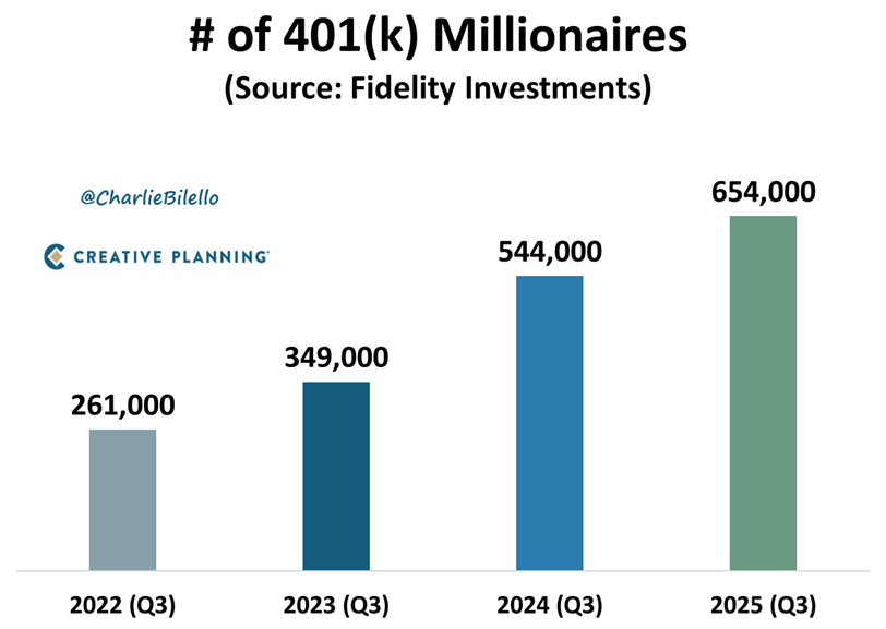מה רואים בגרף: מספר האנשים שיש להם מעל מיליון דולר בחשבון הפרישה שלהם (בפידליטי בלבד) הגיע לשיא של 654,000 איש. זהו זינוק של יותר מפי שניים מלפני שלוש שנים.