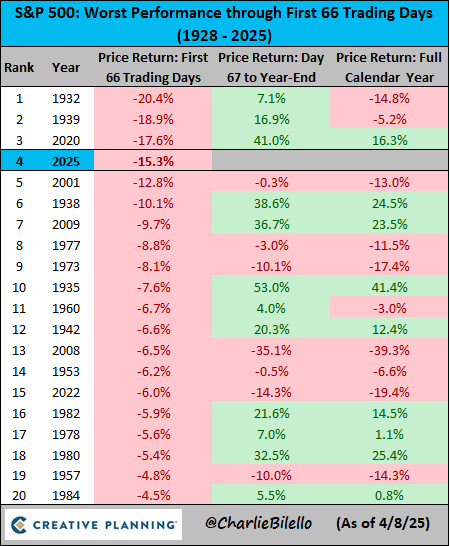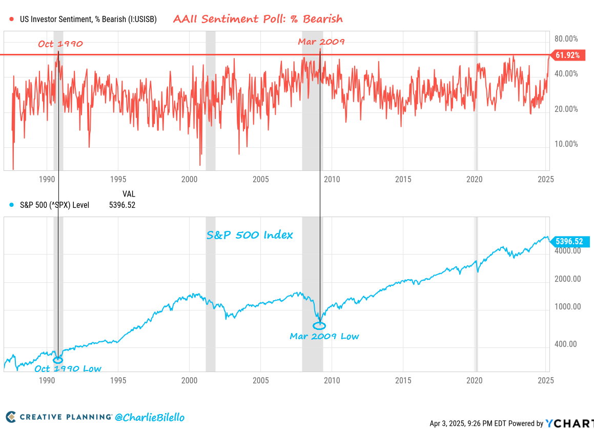 חודש אפריל האחרון סיפק לנו דוגמה חיה למושג "דם ברחובות". במהלך מה שכונה "טאריף טנטרום" (בהלה סביב מכסים), ראינו את אחת הירידות החדות ביותר בהיסטוריה בטווח של ארבעה ימים . סנטימנט המשקיעים צלל לשפל, כאשר אחוז ה"דוביים" בסקר ה-AAII זינק ל-62%, הרמה הגבוהה ביותר מאז השפל של המשבר הפיננסי במרץ 2009.