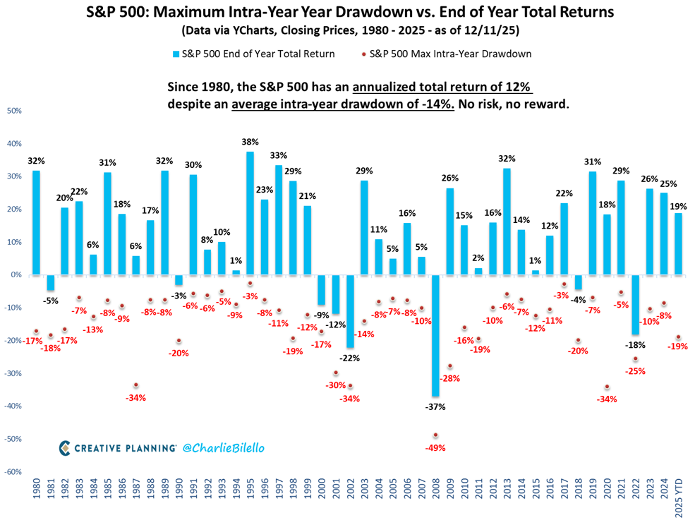 הגרף שמציג את הירידות תוך-יומיות (Drawdowns) לעומת התשואה השנתית הוא אחד החשובים ביותר להבנה. הוא מראה שמאז 1980, המדד חווה ירידה ממוצעת של 14% בתוך השנה, ועדיין מסיים את השנה בתשואה חיובית ממוצעת של 12%.