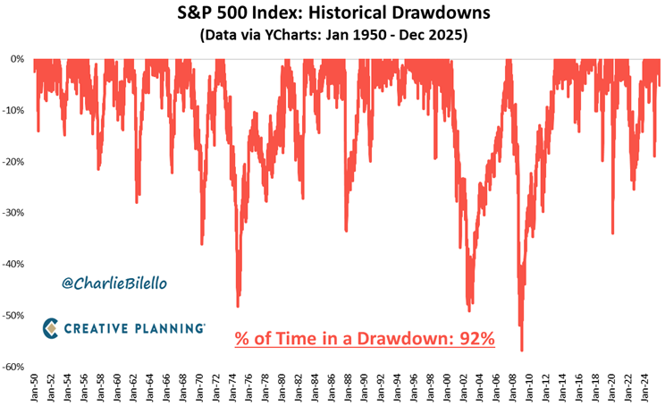 למעשה, השוק נמצא במצב של "Drawdown" (ירידה מהשיא) במשך 92% מהזמן. מי שלא מוכן לסבול את התנודתיות הזו ואת הצבע האדום בתיק ברוב ימות השנה, לא יוכל ליהנות מהתשואה ארוכת הטווח.