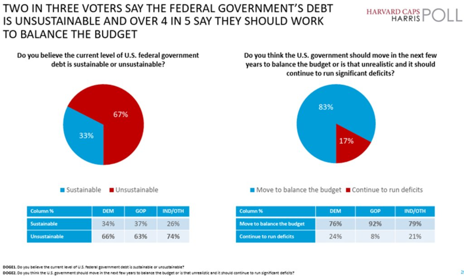 בעוד ששוק המניות חגג, הגרף של החוב הלאומי האמריקאי המשיך במגמה המדאיגה שלו. למרות שרוב מוחלט של הציבור האמריקאי (67%) מאמין שהחוב אינו בר קיימא, ולמרות ש-83% תומכים באיזון התקציב, הפוליטיקה מכתיבה מציאות אחרת.