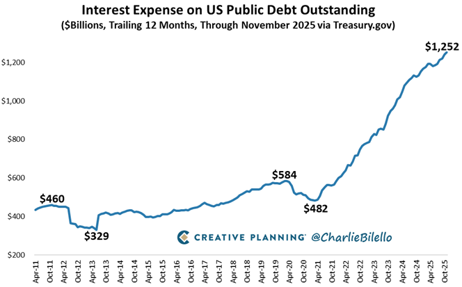 הנתון המבהיל באמת בגרף למטה הוא תשלומי הריבית. ארה"ב משלמת כעת 1.25 טריליון דולר בשנה רק על ריבית - סכום הגבוה יותר מכל תקציב הביטחון האמריקאי.