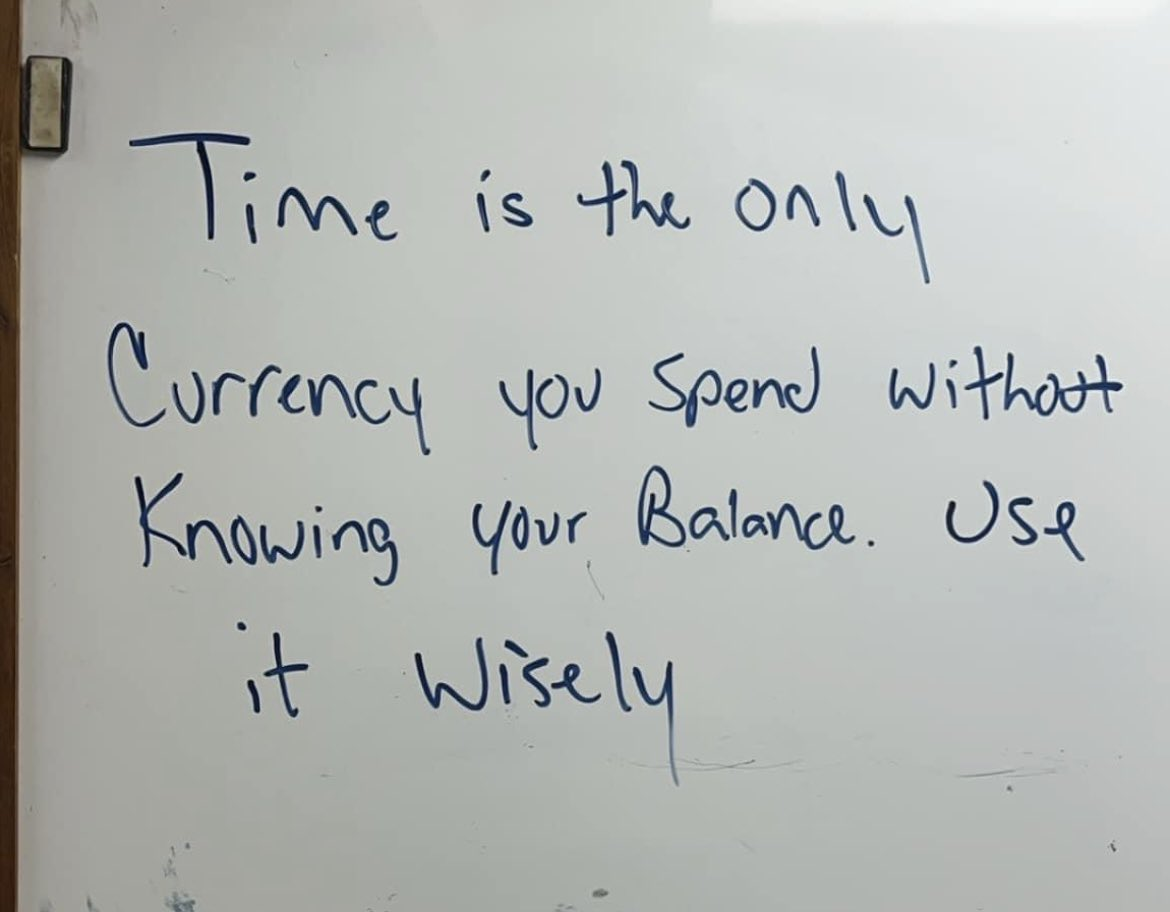 לסיום, הגרף האחרון אינו גרף פיננסי, אלא תזכורת פילוסופית. הכיתוב על הלוח מזכיר לנו ש"זמן הוא המטבע היחיד שאתם מוציאים בלי לדעת את היתרה שלכם".